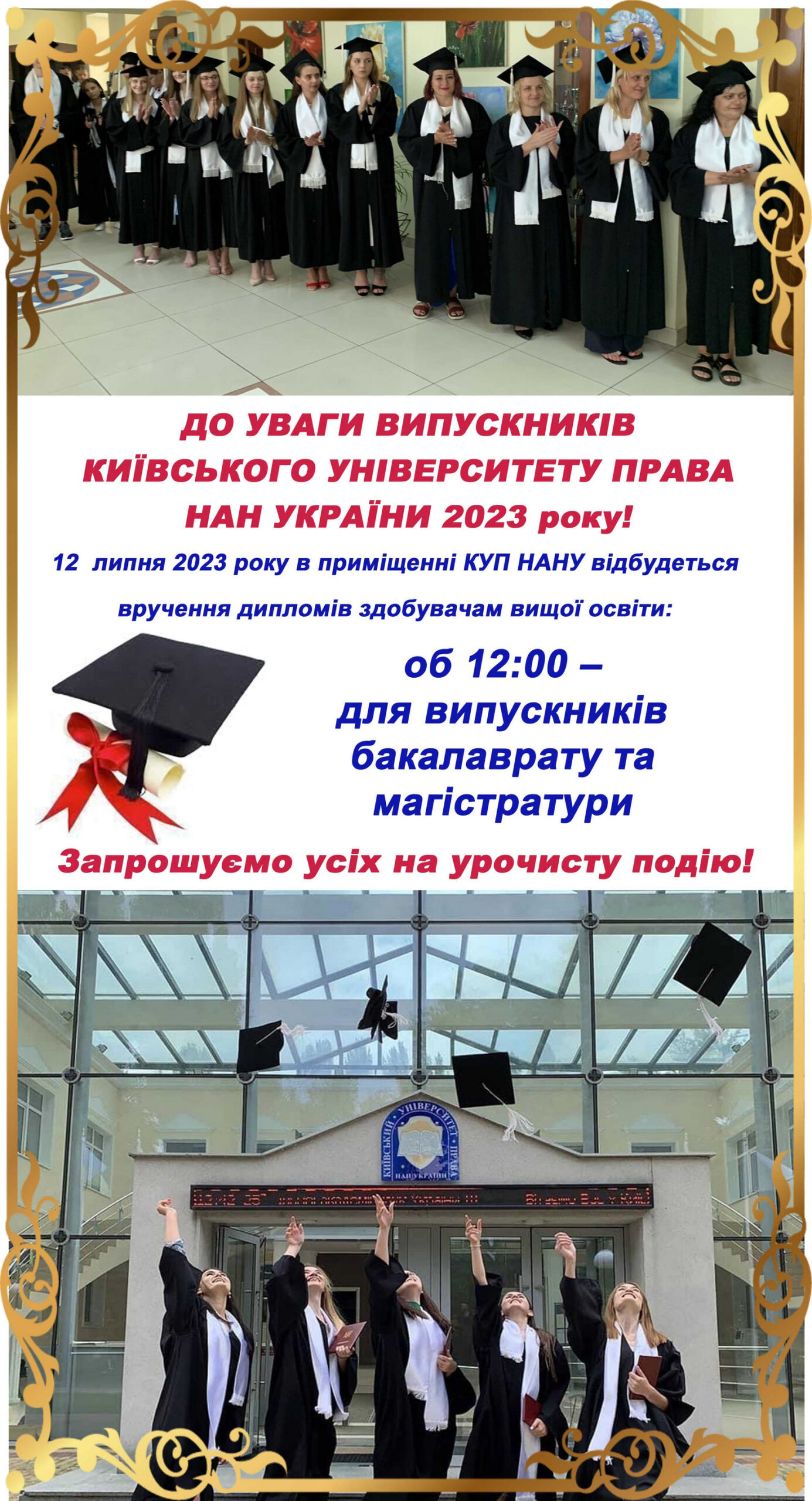 Запрошуємо Вас на урочисті заходи з нагоди вручення дипломів,