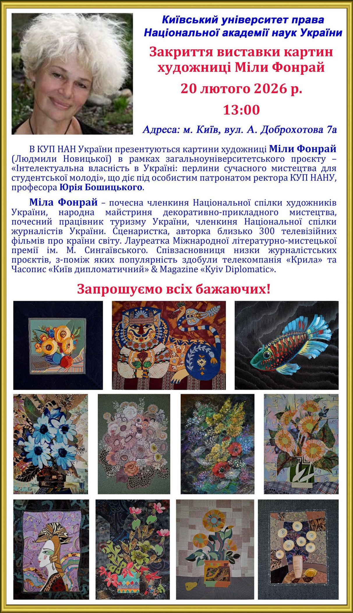 Увага! Відбудеться закриття виставки картин художниці Міли Фонрай