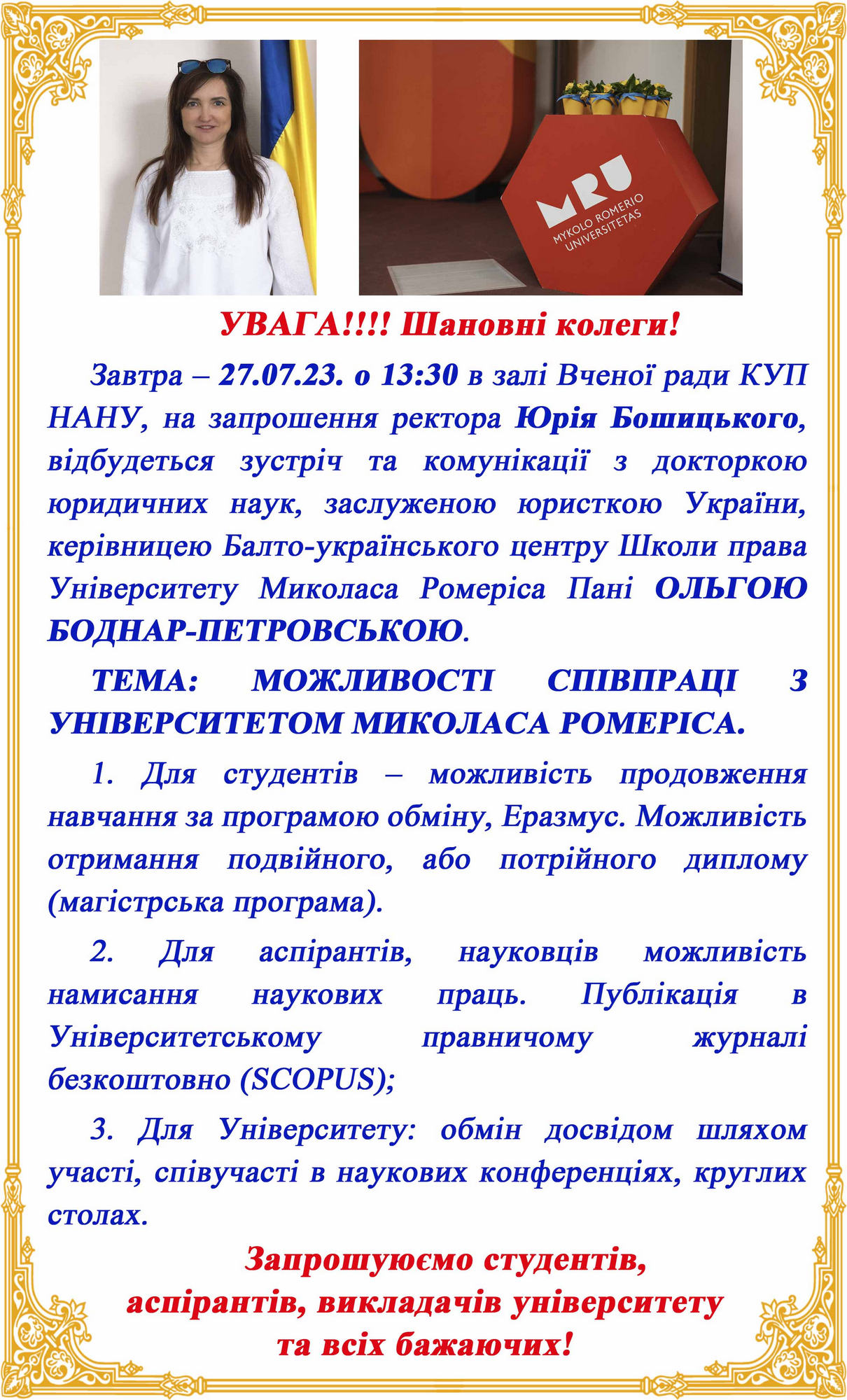 УВАГА! Відбудеться зустріч з керівницею Балто-українського центру Школи права Університету Миколаса Ромеріса