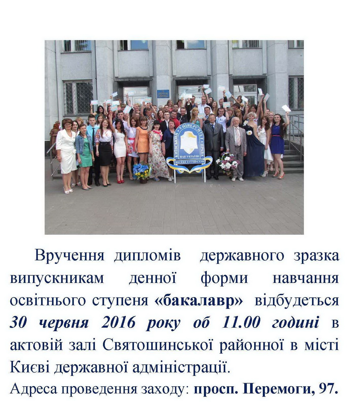 Увага! Вручення дипломів державного зразка випускникам денної форми навчання освітнього ступеня «бакалавр» відбудеться 30 червня 2016 року