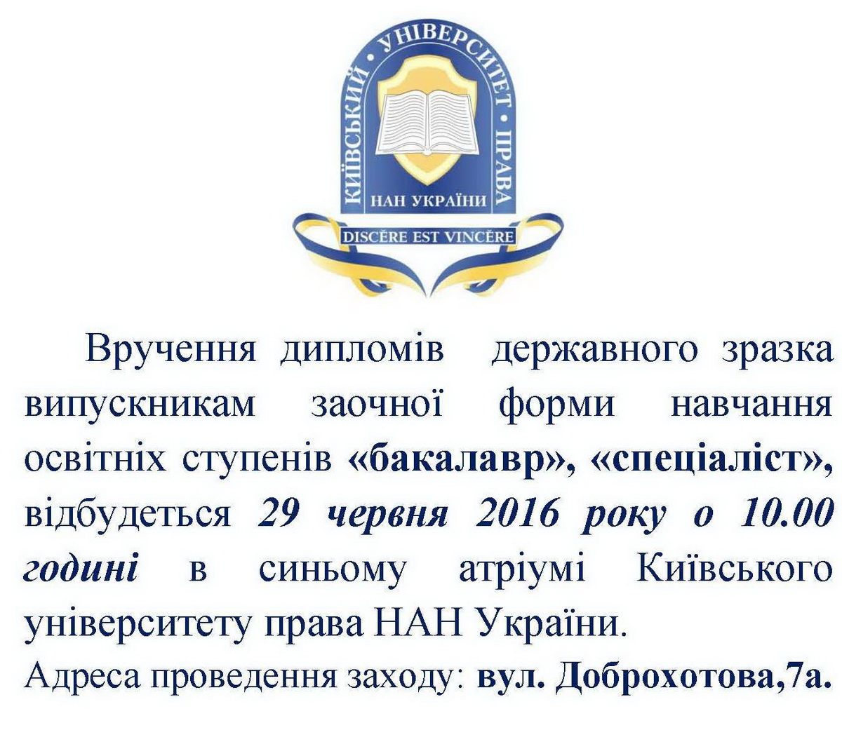 Увага! Вручення дипломів державного зразка випускникам заочної форми навчання освітніх ступенів «бакалавр», «спеціаліст» відбудеться 29 червня 2016 року