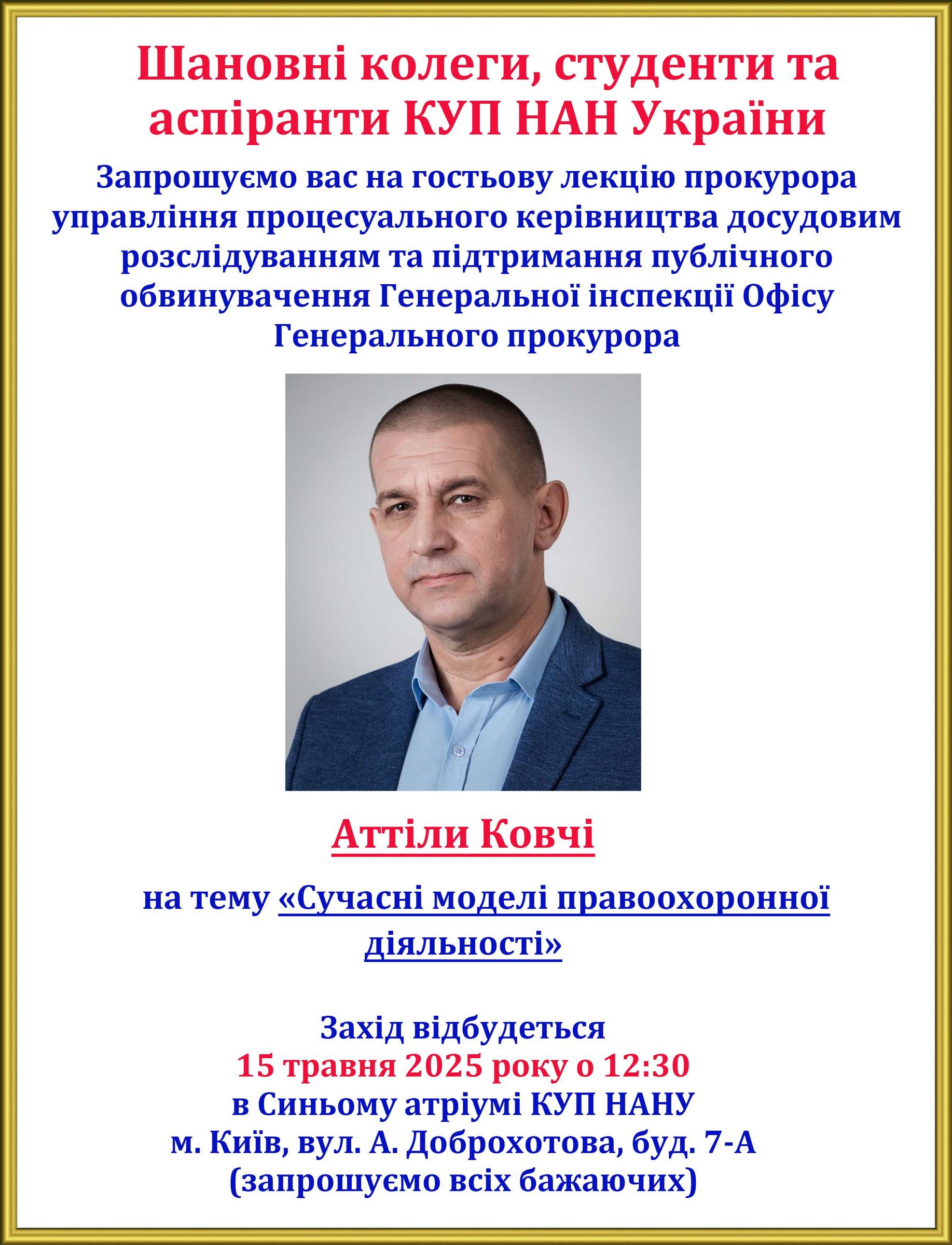 Увага! Запрошуємо на гостьову лекцію прокурора управління процесуального керівництва досудовим розслідуванням та підтримання публічного обвинувачення Генеральної інспекції Офісу Генерального прокурора Аттіли Ковчі