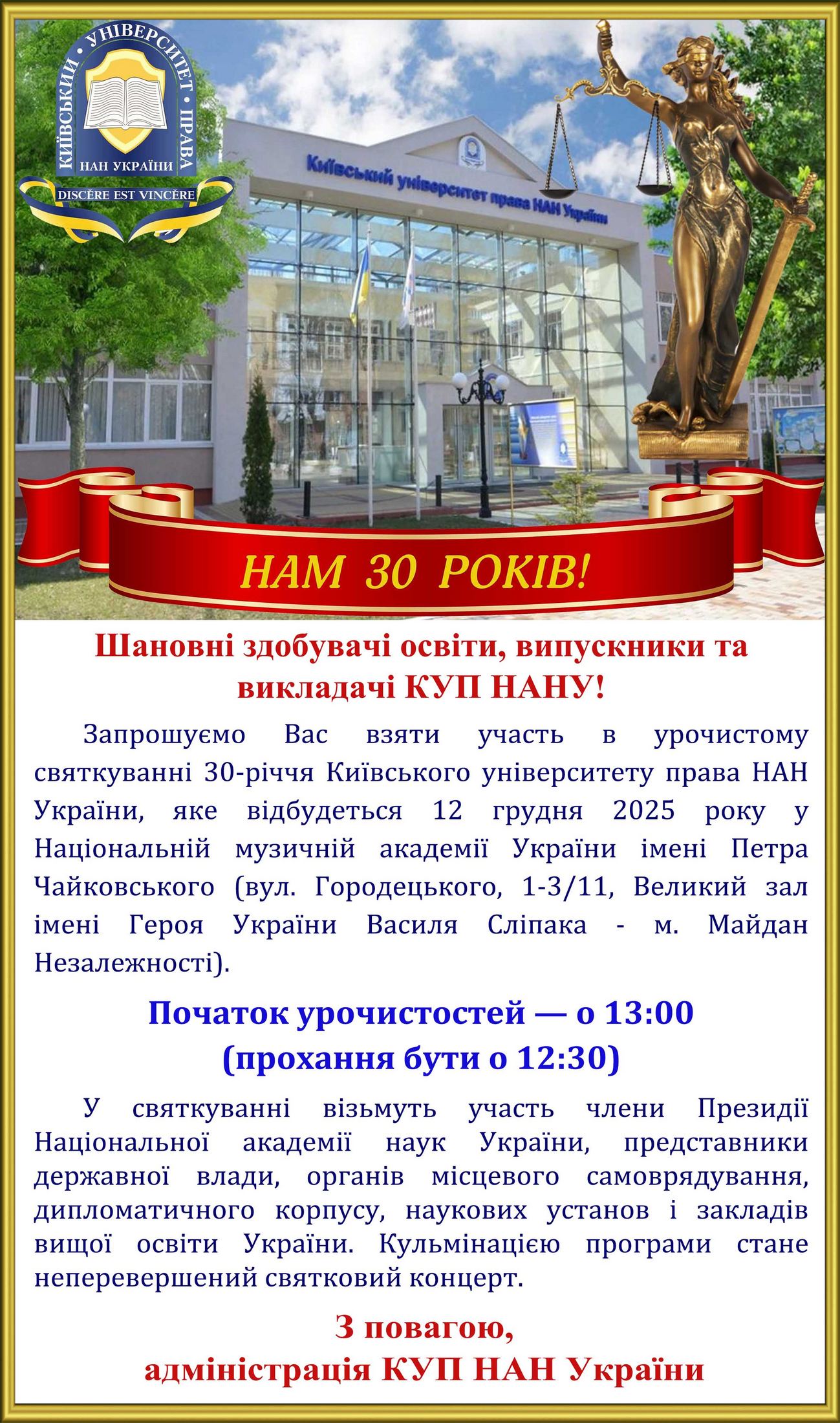 Увага! Запрошуємо на урочисте святкування 30-річчя Київського університету права НАН України