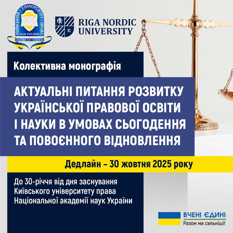 Київський університет права Національної академії наук України та Ризький північний університет запрошують взяти участь у роботі групи авторів з метою підготовки колективної монографії на тему «Актуальні питання розвитку української правової освіти і науки в умовах сьогодення та повоєнного відновлення».