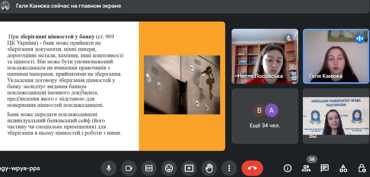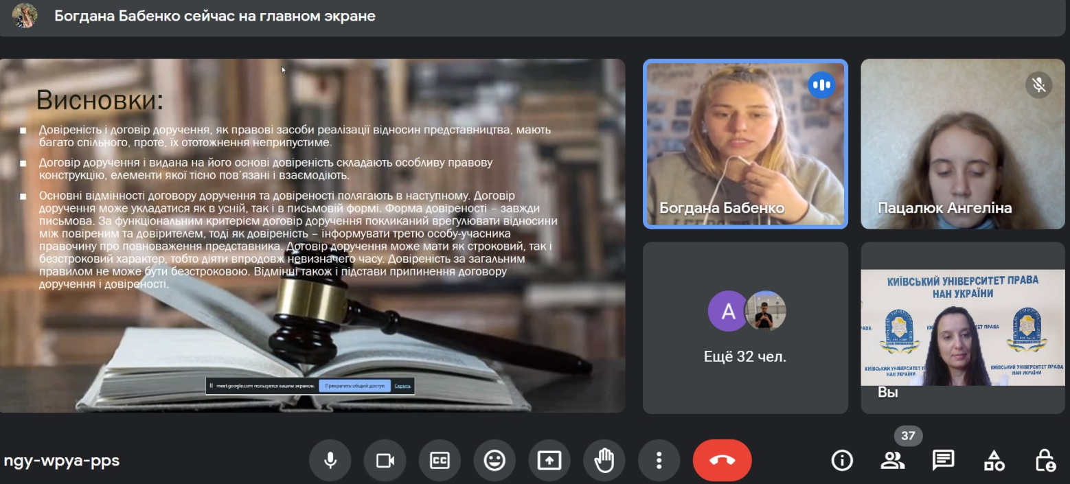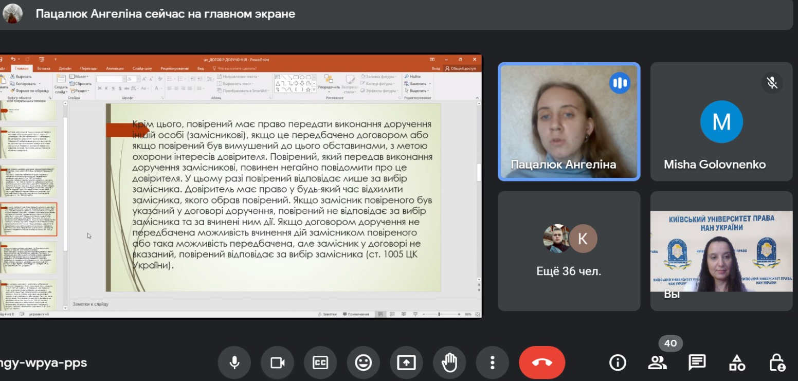 Круглий стіл організовано в рамках роботи гуртка з цивільного права, у якому взяли участь 37 здобувачів вищої освіти спеціальності 081 «Право», які підготували змістовні доповіді з презентаціями.