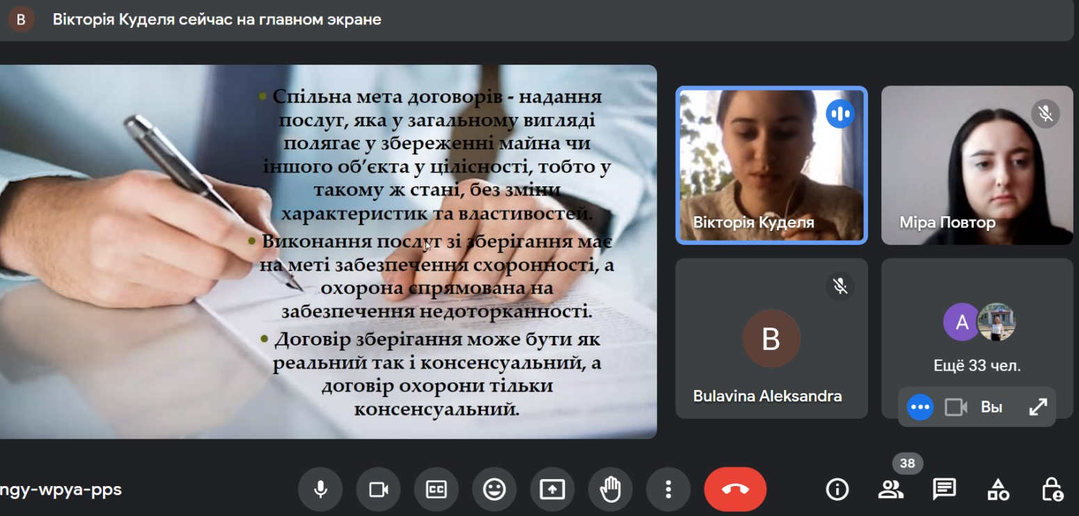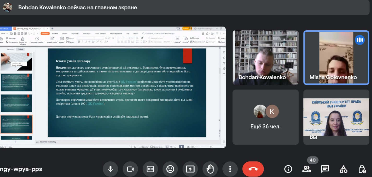 Оскільки метою договірних зобов’язань є досягнення сторонами певних правових результатів, особливого значення набуває їх виконання, тому студенти в своїх виступах акцентували увагу саме на проблемах виконання договірних зобов’язань в умовах воєнного стану.