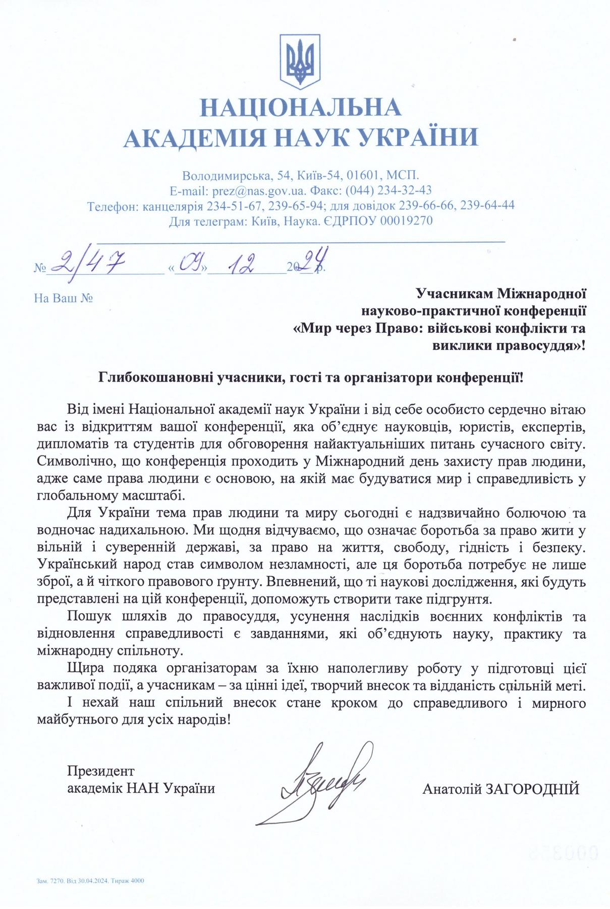Вітальний лист учасникам конференції надіслав Президент Національної академії наук України, академік НАН України Анатолій ЗАГОРОДНІЙ.