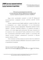На адресу організаторів та учасників конференції надійшли листи привітання від Президента Національної академії наук України, академіка НАН України Б.Є.Патона, Надзвичайного і Повноважного Посла Республіки Болгарії в Україні Дімітара Цветкова Владімірова, Голови Союзу юристів України В.О.Євдокимова, Академіка-секретаря Відділення історії, філософії та права НАН України О.С.Онищенко, Президента Інституту правової політики М.В.Оніщука, в яких зокрема зазначається, що сучасні тенденції розвитку національних правових систем характеризуються гармонізацією та уніфікацією окремих елементів при загальному збереженні та навіть деякому посиленні їхньої специфіки. Наближення правової системи України до європейських стандартів передбачає насамперед реформування та поступове приведення нормативної та інституційної основи до права Європейського Союзу. Тому цілком закономірним та об’єктивним є обрання Київським університетом права НАН України саме такої проблематики для обговорення в форматі міжнародної конференції.
