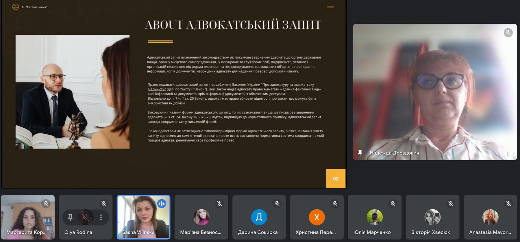- Олександра Вілінська – здобувачка Київського університету права НАН України, помічниця адвоката в адвокатському бюро «Євгена Бойка», яка представила на майстер-класі тему складання процесуальних документів у адвокатській діяльності (адвокатські запити, заяви та клопотання).