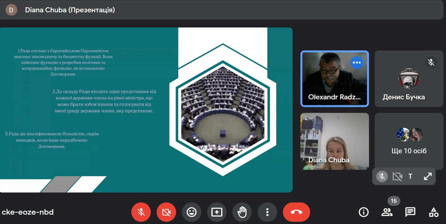 Чуба Діана на тему: «Загальна характеристика Ради ЄС», де зробила стислий огляд розвитку цієї установи в рамках Співтовариств, та дала характеристику особливостей представництва та формування Ради й напрямків її діяльності, інституціалізованих в конфігураціях Ради, відповідно до Лісабонського договору.