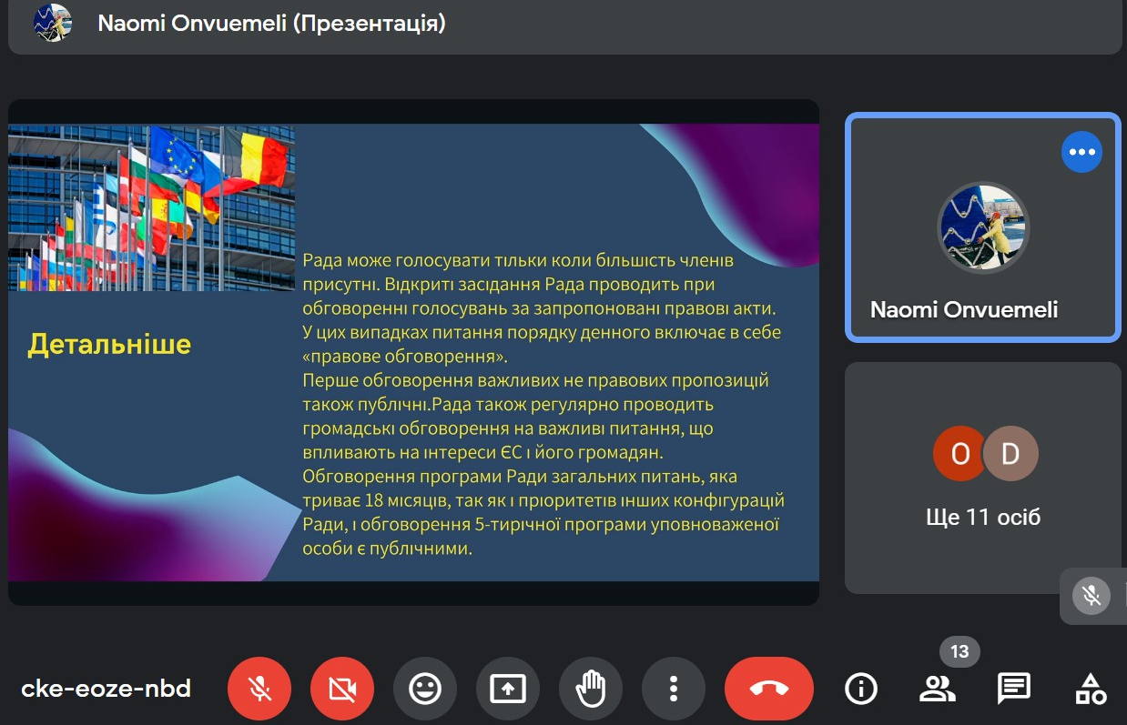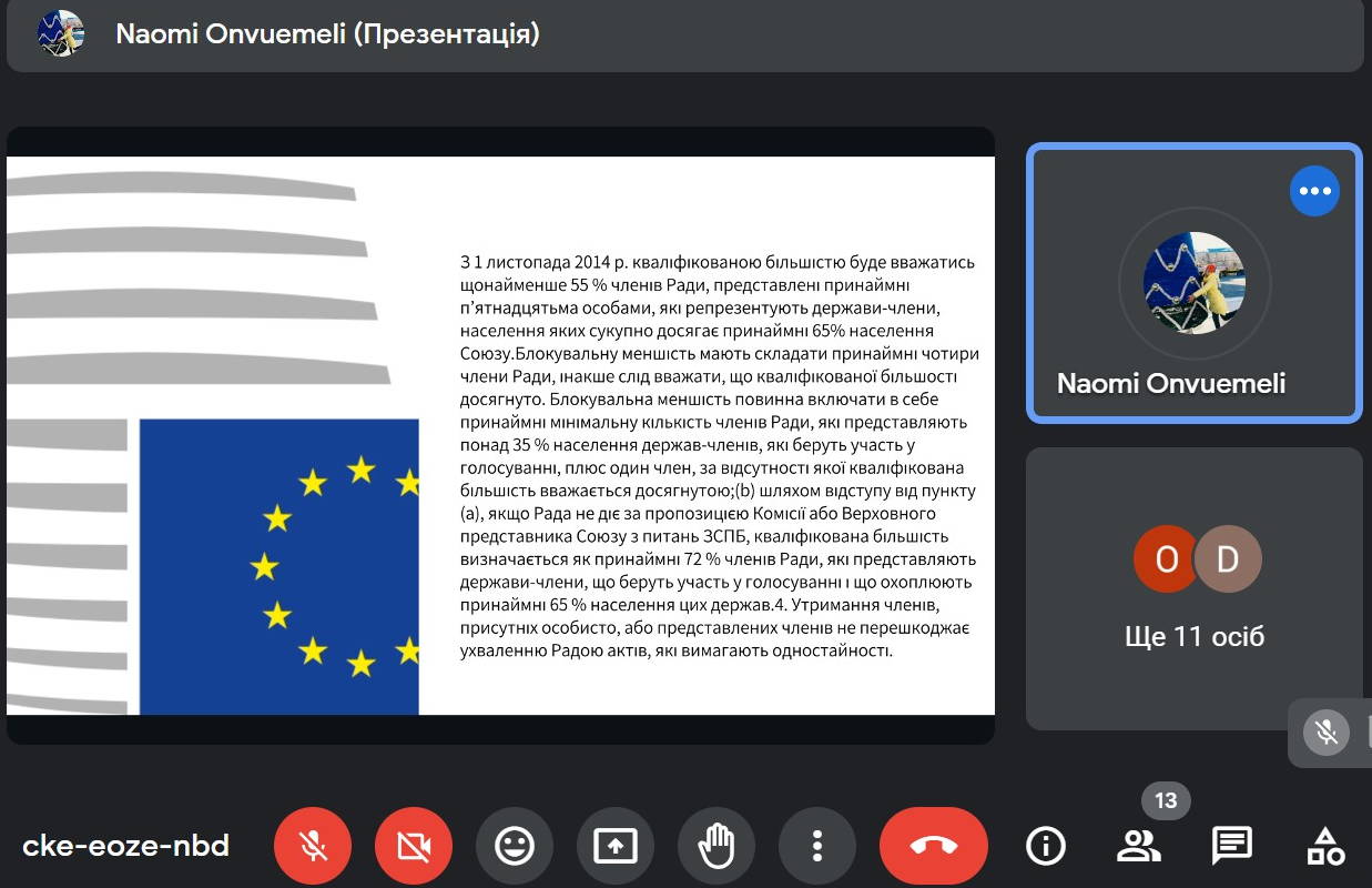 Онвуемелі Наомі на тему: «Процедури голосування в Раді Європейського Союзу», в якій висвітлила особливості реалізації ключової функції Ради – приймати рішення законодавчого та незаконодавчого характеру. Визначено загальні вимоги до прозорості прийняття рішень та передбачені відступи, охарактеризовані підстави та умови голосування в Раді: одностайно та простою і кваліфікованою більшістю
