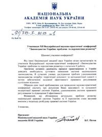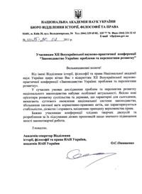 На адресу організаторів та учасників конференції надійшли листи привітання від Президента Національної академії наук Украйни Б.Є. Патона, Академіка-секретаря Відділення історії, філософії та права НАН України О.С.Онищенко.