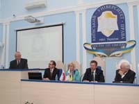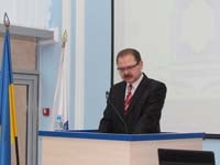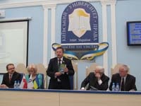 До учасників конференції з привітальним словом звернувся Юрій Михайлович Сафонов, начальник відділу соціально-гуманітарної освіти Міністерства освіти і науки, молоді та спорту України, в якому зокрема зазначив, що основним змістом діяльності класичного університету на сучасному етапі повинно стати формування інноваційного, гуманістичного освітньо-виховного середовища, що, в свою чергу, передбачає фахову глибину і інноваційні технології в системі освіти та науки з метою інтеграції у європейський освітянський простір. Науково-дослідна діяльність є одним із головних засобів досягнення державних стандартів якості підготовки фахівців з вищою освітою та реалізується шляхом інтеграції навчально-виховного процесу і науки, проведення різного формату наукових заходів із залученням до участі в них науково-педагогічних працівників та студентської молоді. І підтвердженням цієї тези є саме такий науковий форум, що проводиться Київським університетом права НАН України.