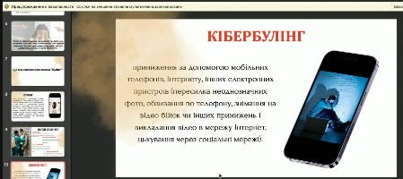 Окремо доповідач роз’яснила види булінгу, які ознаки кожного із них, а також на прикладі реальних життєвих кейсів продемонструвала важливість протидії булінгу чи будь-якому виду насильства як з позиції жертви таких дій, так і стороннього спостерігача, наголошуючи, що явище булінгу притаманне середовищу неповнолітніх осіб, тоді як цькування у колективі навчального середовища дорослих людей юридично оцінюється як певний вид насильства. Тому у доповіді цілком органічно йшлося про насильство та відповідальність за ці дії й реакцію соціального оточення на існування поруч цькувань у молодому колективі здобувачів вищої освіти.