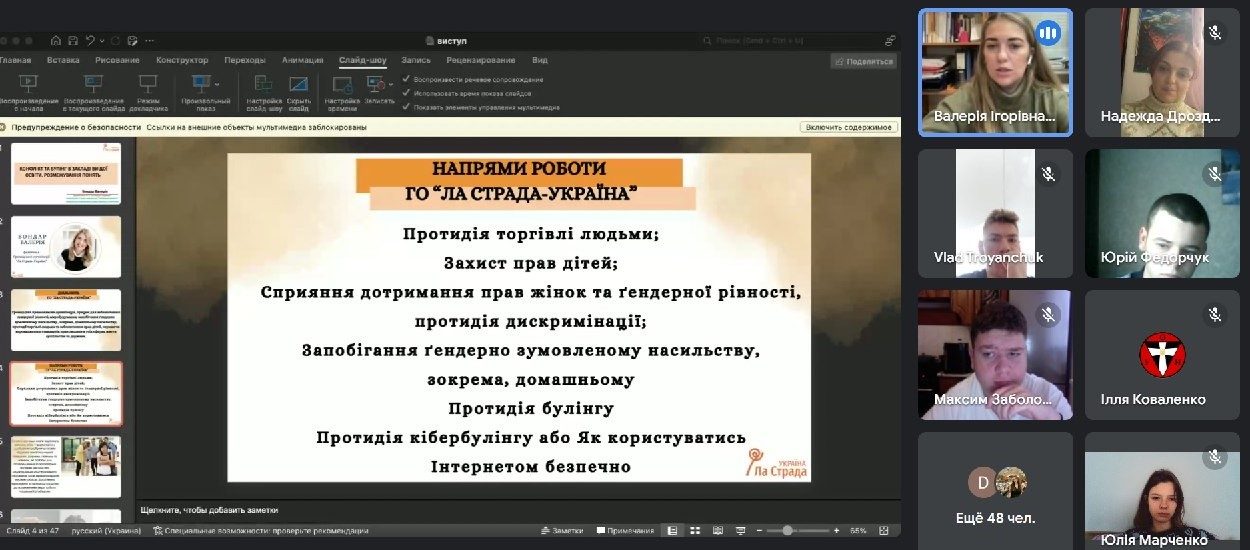 21 листопада 2024 року для студентів Київського університету права НАН України відбулася онлайн-зустріч із фахівчинею громадської організації «Ла Страда-Україна» Валерією Бондар, організована кафедрою кримінального права та процесу, за участю куратора другого курсу спеціальності «Право» кандидаткою юридичних наук, доцентки цієї ж кафедри Надії Дроздович, а також доцентки кафедри, кандидатки юридичних наук Наталії Веселовської. Тема зустрічі стосувалася КОНФЛІКТІВ ТА БУЛІНГУ В ЗАКЛАДАХ ВИЩОЇ ОСВІТИ.