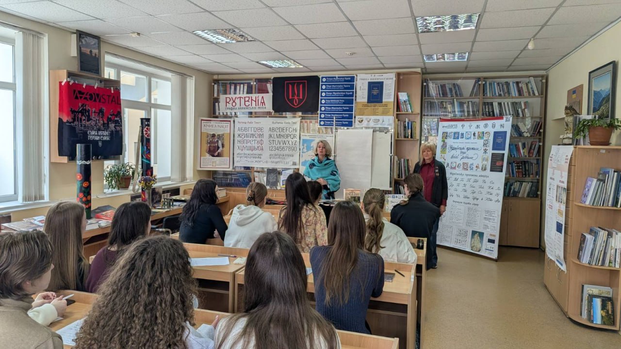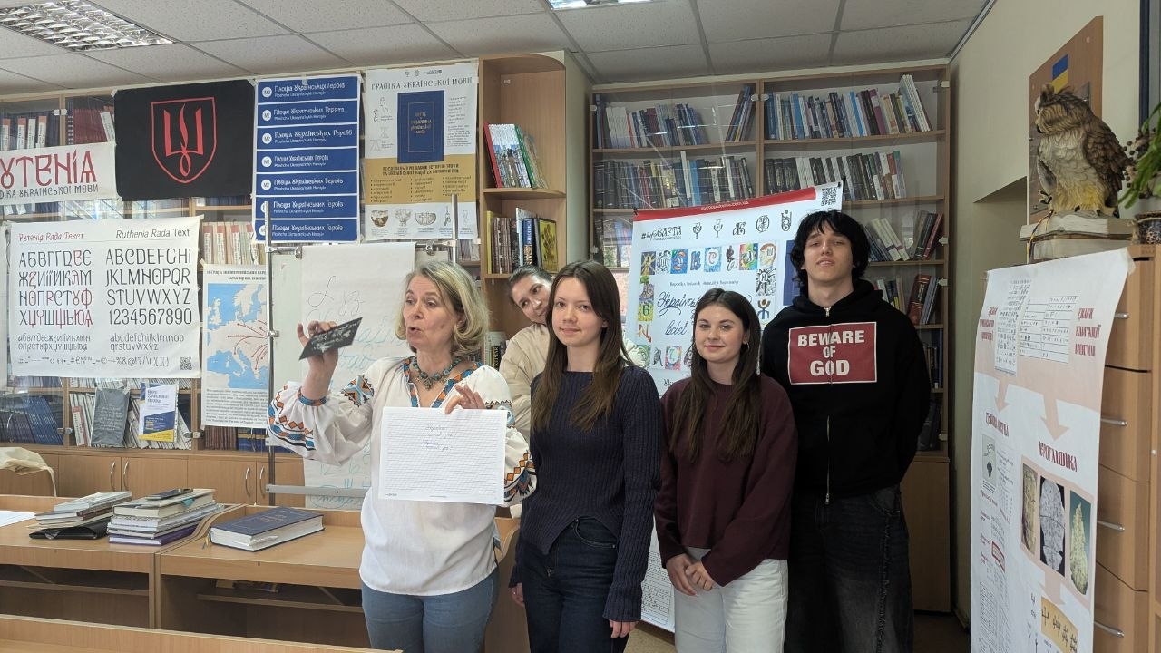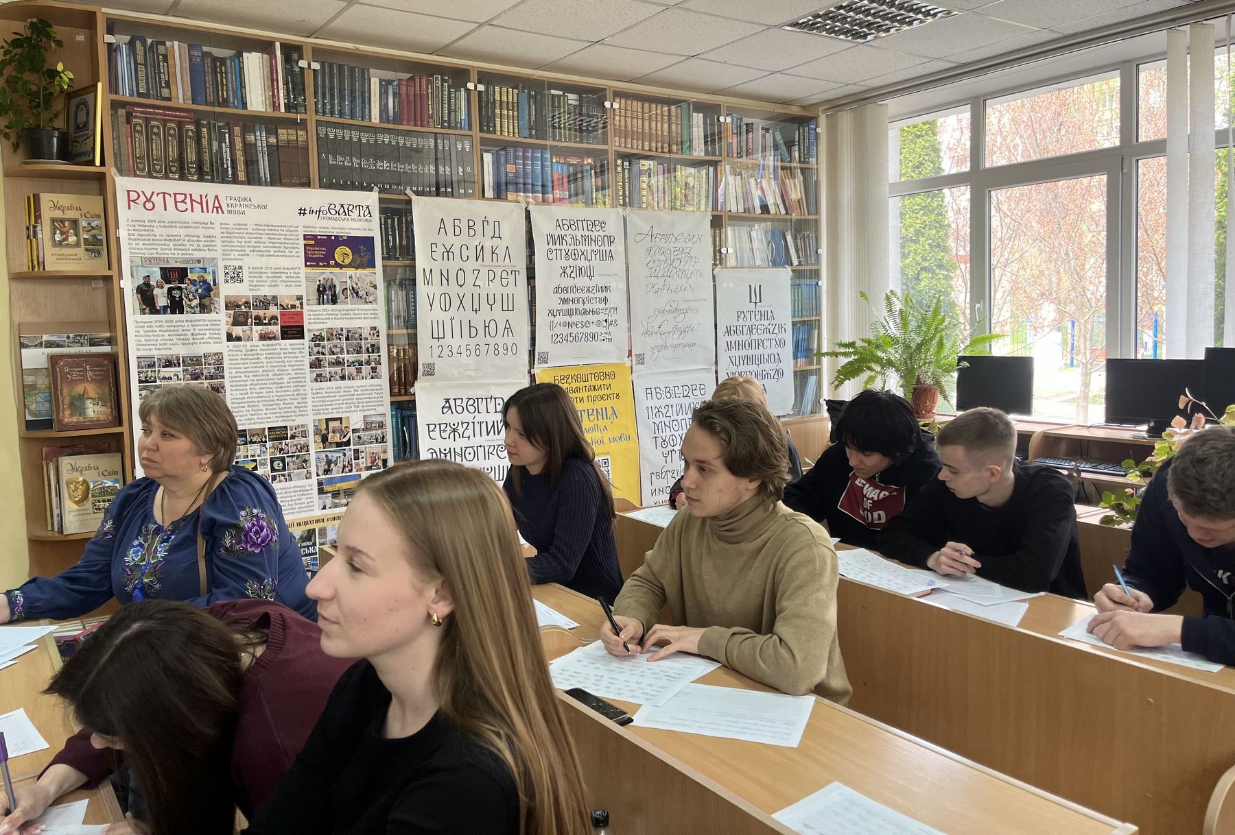 Також студенти мали можливість власноруч створити напис “Україна понад усе” РУТЕНІЄЮ, дізнатись чому саме назва «Рутенія» та така дивна рутенська літера «Р» з хвостиком, графему якої ніколи не сплутаєш з латинською графемою літери «П»? Скільки років символу (графемі) головної літери української абетки? На ці та ще сотні питань відомої світу історії, але покладені в схованки історичних брехунців, відповідає видання «Буття та обʼявлення української мови» – історичної складової проєкту “Рутенія. Графіка української мови”.