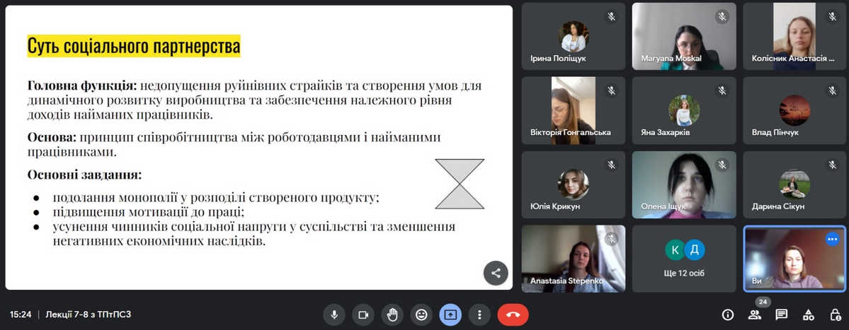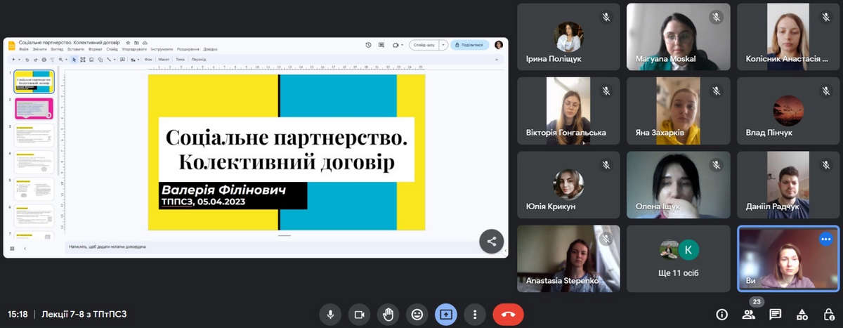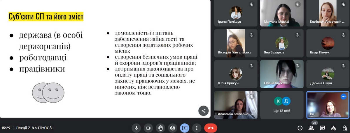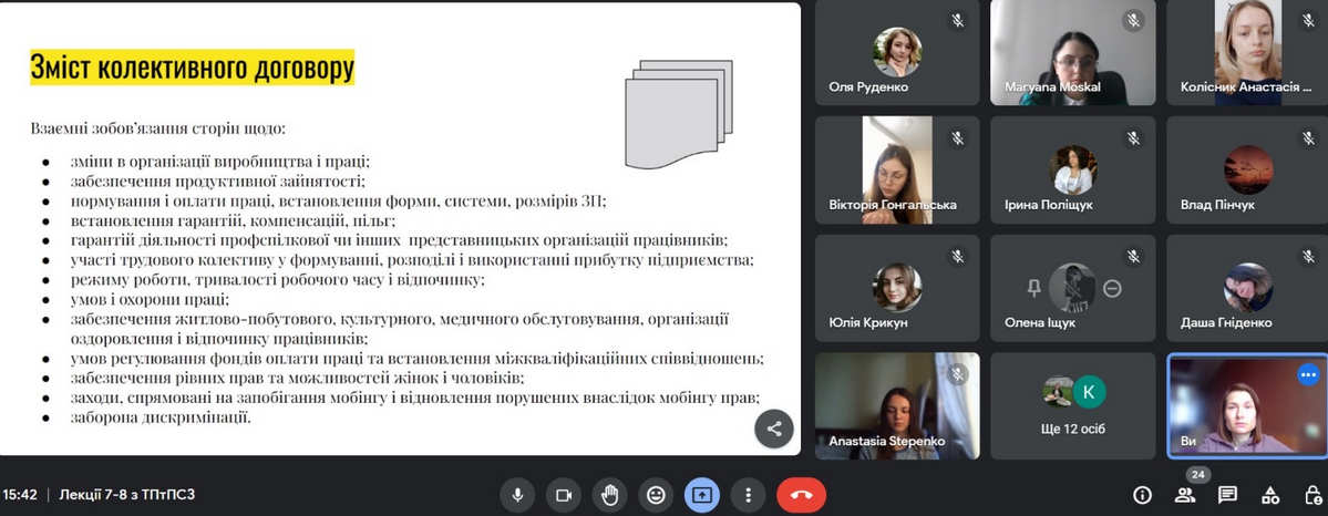 Наприкінці лекції здобувачі вищої освіти мали змогу поставити питання лекторці, зокрема щодо відповідальності сторін за невиконання колдоговорів та їх небажання діяти в рамках соціального партнерства. Такі заходи відіграють важливу роль у професійній підготовці студентів, адже сприяють формуванню у них як загальних, так і спеціальних компетентностей, набуттю теоретичних та практичних навичок, що стануть у нагоді під час їх трудового шляху.