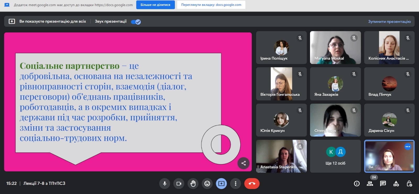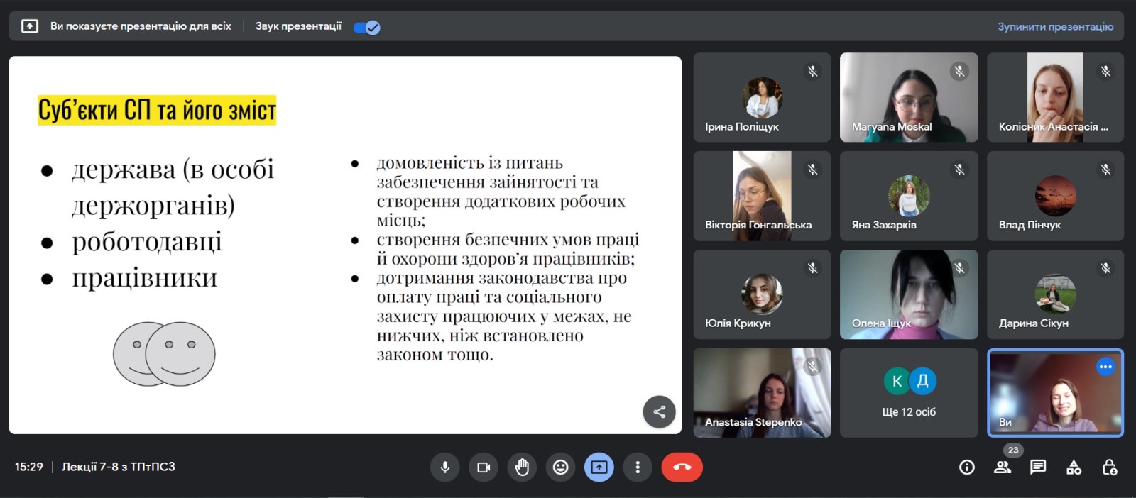 5 квітня для здобувачів освіти Київського університету права НАН України відбулася лекція-диспут на тему «Соціальне партнерство. Колективний договір». Захід було організовано кафедрою міжнародного права та галузевих правових дисциплін для випускників 4-го курсу спеціальності 081 «Право» в рамках навчальної дисципліни «Трудове право та право соціального забезпечення». Лекція-диспут відбулася в онлайн-форматі на платформі Google Meet.