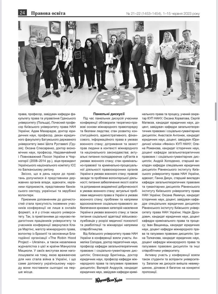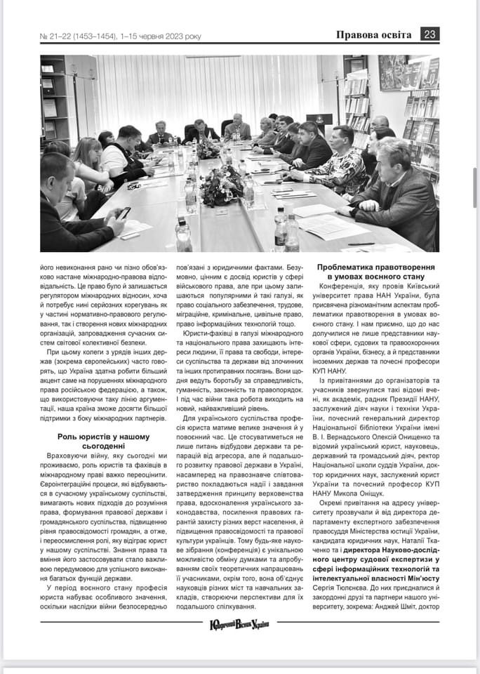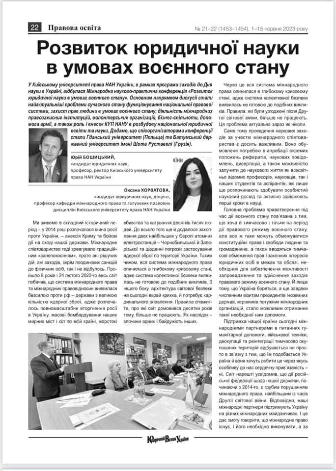Нещодавно в найавторитетнішій загальнонаціональній правничій газеті «ЮРИДИЧНИЙ ВІСНИК УКРАЇНИ» вийшла стаття ректора КУП НАН України професора Юрія Бошицького та завідувачки кафедри міжнародного права та галузевих правових дисциплін Київського університету права НАН України доценткині Оксани Хорватової, щодо ролі та розвитку юридичної науки в умовах воєнного стану.