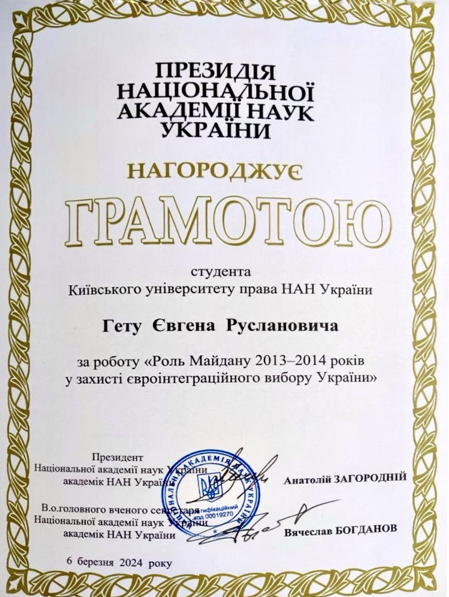 Євгена Гету, здобувача четвертого курсу першого (бакалаврського) рівня навчання Київського університету права НАН України за роботу «Роль Майдану 2013-2014 років у захисті євроінтеграційного вибору України».