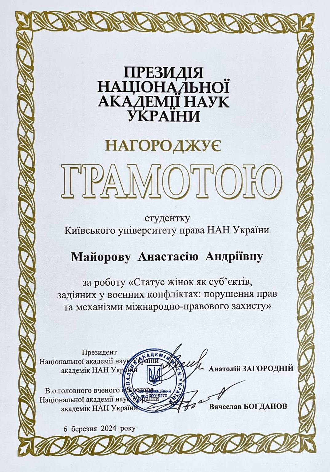 Анастасію Майорову, здобувачку першого курсу другого (магістерського) рівня навчання Київського університету права НАН України за роботу «Статус жінок як суб’єктів, задіяних у воєнних конфліктах: порушення прав та механізми міжнародно-правового захисту»;