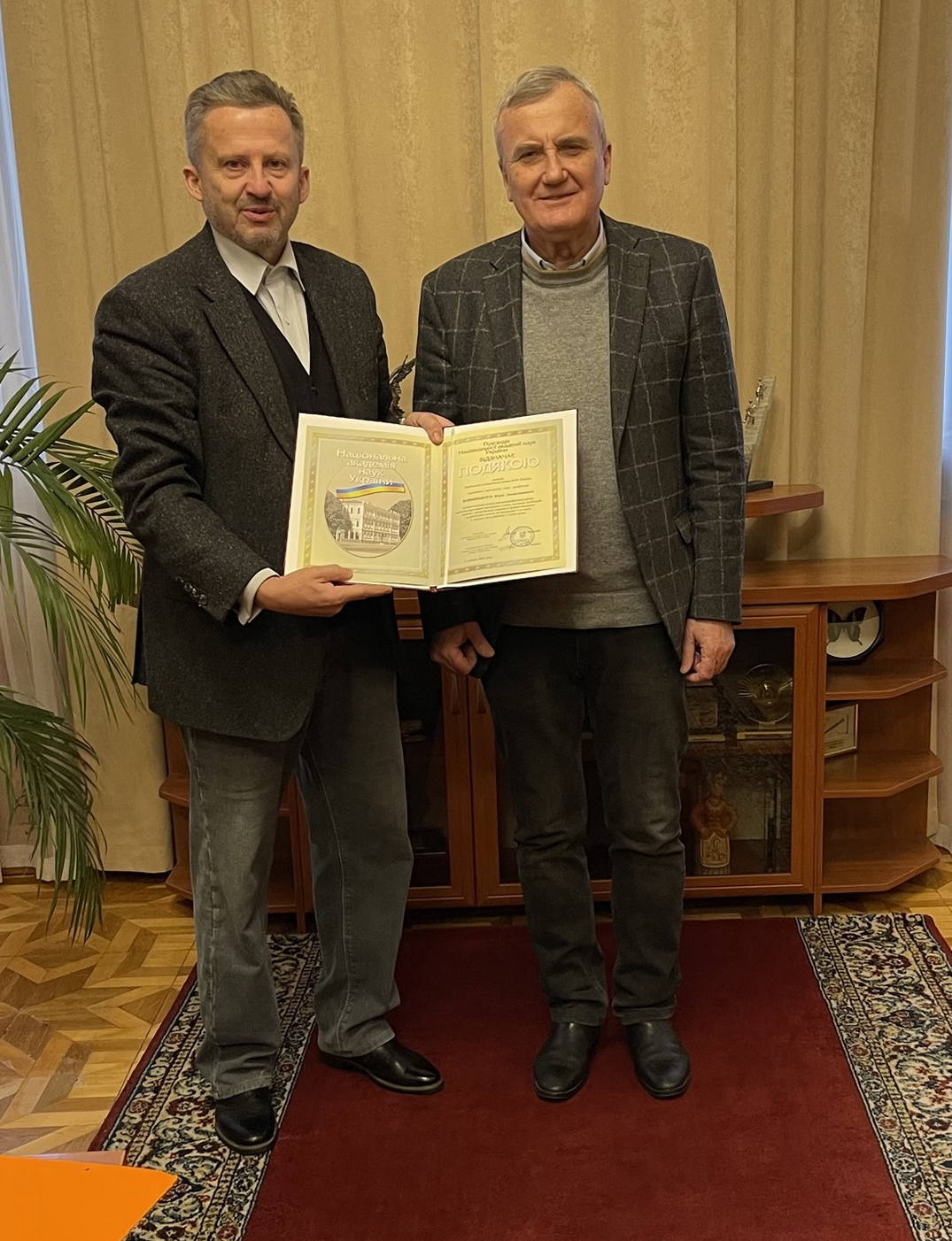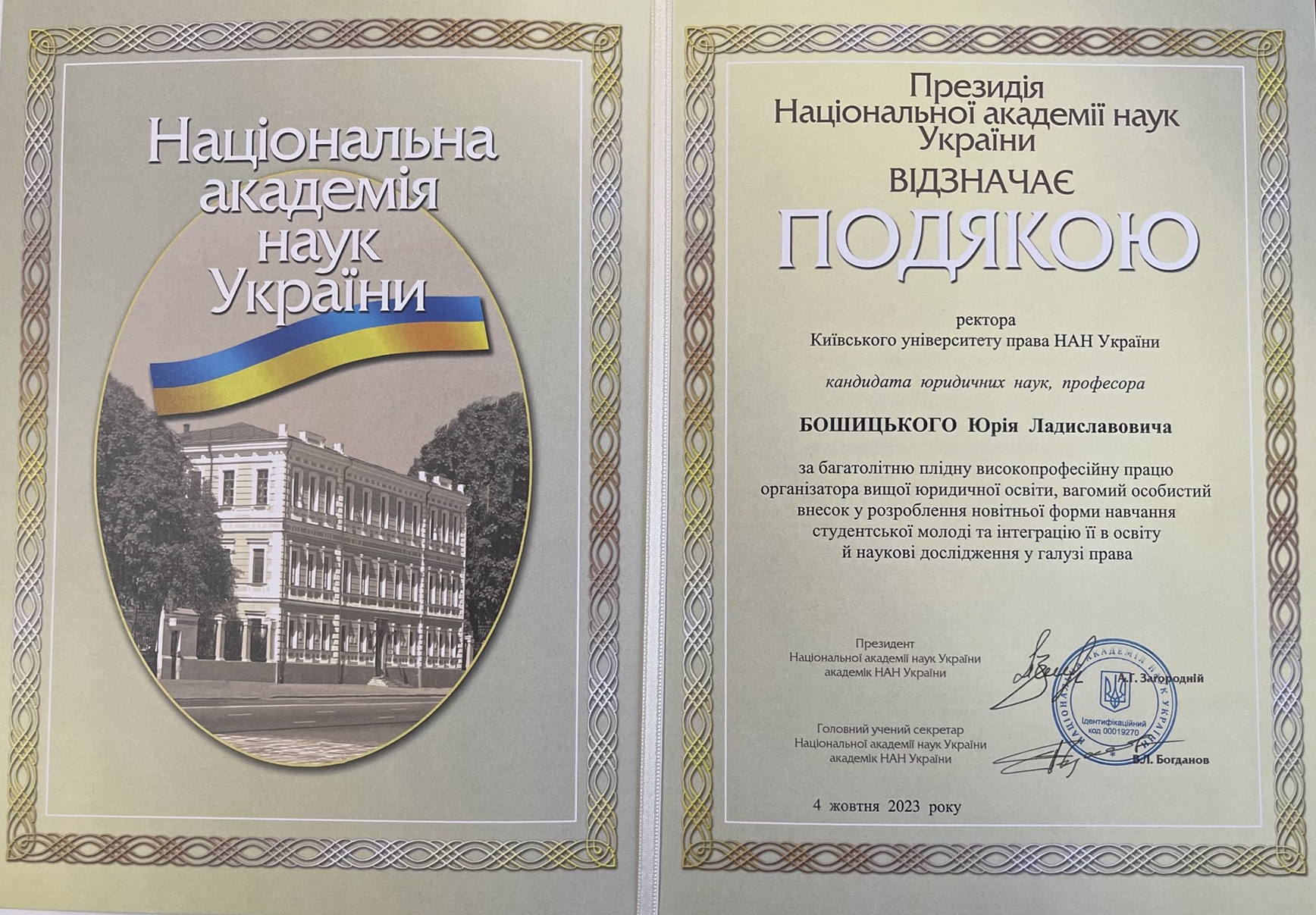 На завершення зустрічі президентом НАН України Анатолієм Загороднім було вручено подяку ректорові за багатолітню плідну високопрофесійну працю організатора вищої юридичної освіти, вагомий особистий внесок у розроблення новітньої форми навчання студентської молоді та інтеграцію її в освіту й наукові дослідження у галузі права. Безумовно, що ця подяка є , в цілому, і визнанням результативності роботи колективу Київського університету права НАН України у 2023 році.