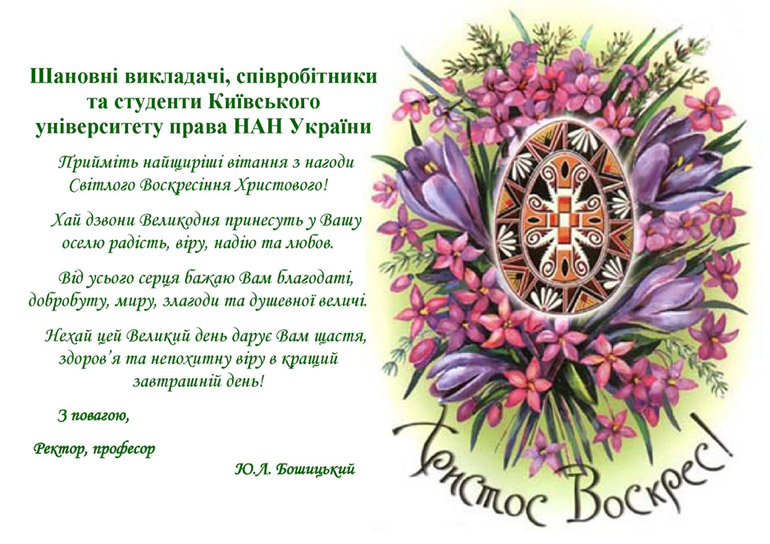 Вітання ректора КУП НАН України Бошицького Ю.Л з великим святом Христового Воскресіння