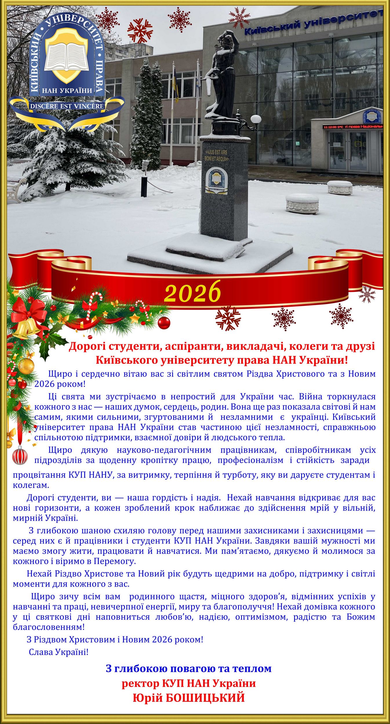 Вітання ректора КУП НАНУ з Різдвом Христовим та Новим Роком