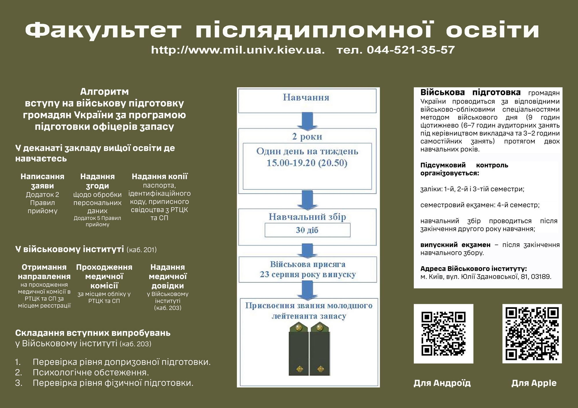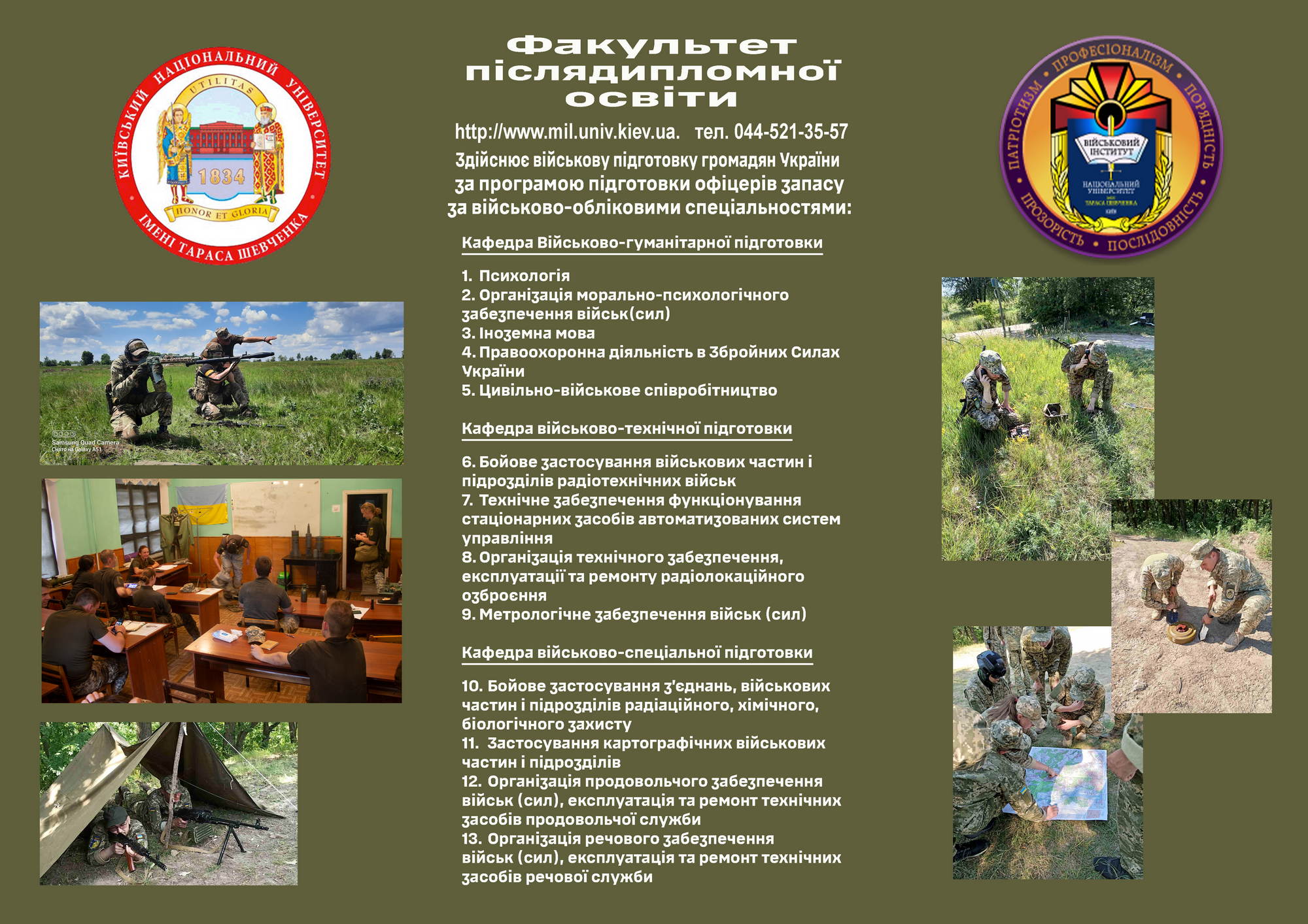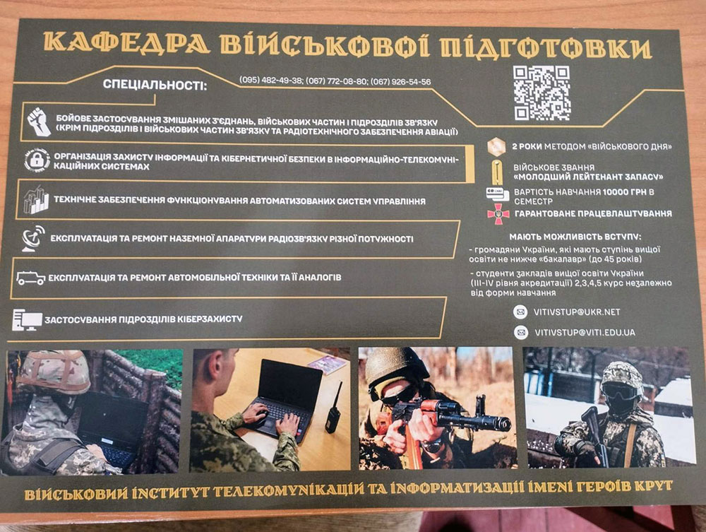 Підготовка проводиться на базі Військового інституту при Київському національному університеті імені Тараса Шевченка, або Військовому інституті телекомунікацій та інформатизації імені Героїв Крут, кафедрі військової підготовки національного університету оборони України. Після закінчення навчання студентам присвоюється офіцерське звання лейтенант запасу.