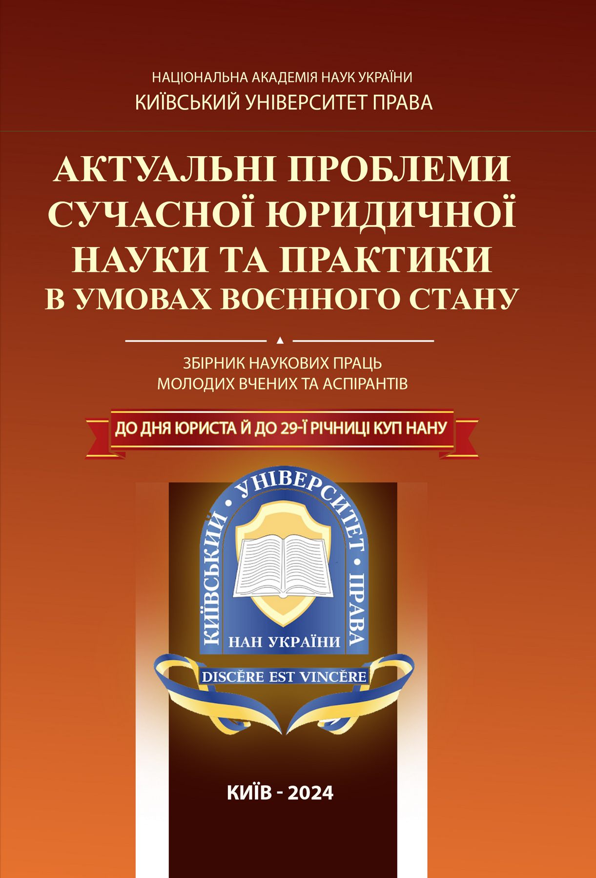 Традиційно, до 29-річниці Київського університету права НАН України, за матеріалами круглого столу «Актуальні проблеми сучасної юридичної науки та практики в умовах воєнного стану» силами відділу аспірантури було підготовлено та видано збірник наукових праць молодих вчених та аспірантів КУП НАН України.