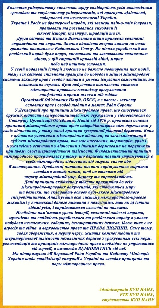 Звернення трудового колективу та студентства Київського університету права НАН України до освітянської та наукової громадськості з приводу ситуації, що склалася в Україні