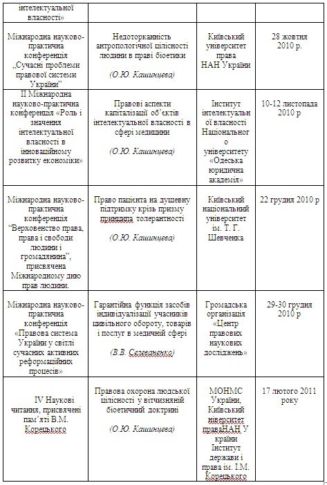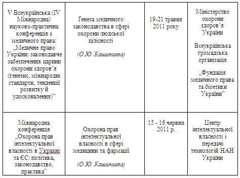 Участь у роботі Української Медико-правової Асоціації (О.Ю. Кашинцева – член правління)